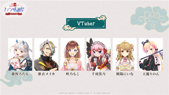 朝陽にいな、天籠りのん、歌衣メイカ、咲乃もこ、千羽黒乃、龍惺ろたん