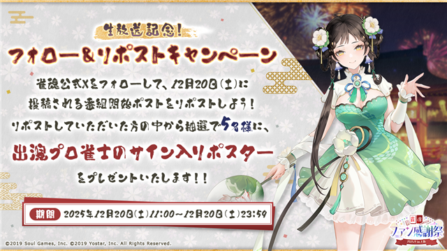 Yostarは、対戦型麻雀ゲーム『雀魂-じゃんたま-』において、12月20日にグランキューブ大阪(大阪府立国際会議場)にて入場無料で開催するリアルイベント『雀魂ファン感謝祭2025冬in大阪』の特設サイトを更新し、同イベントで実施する各種プログラムや出演者、物販等の情報を公開したことを発表した。