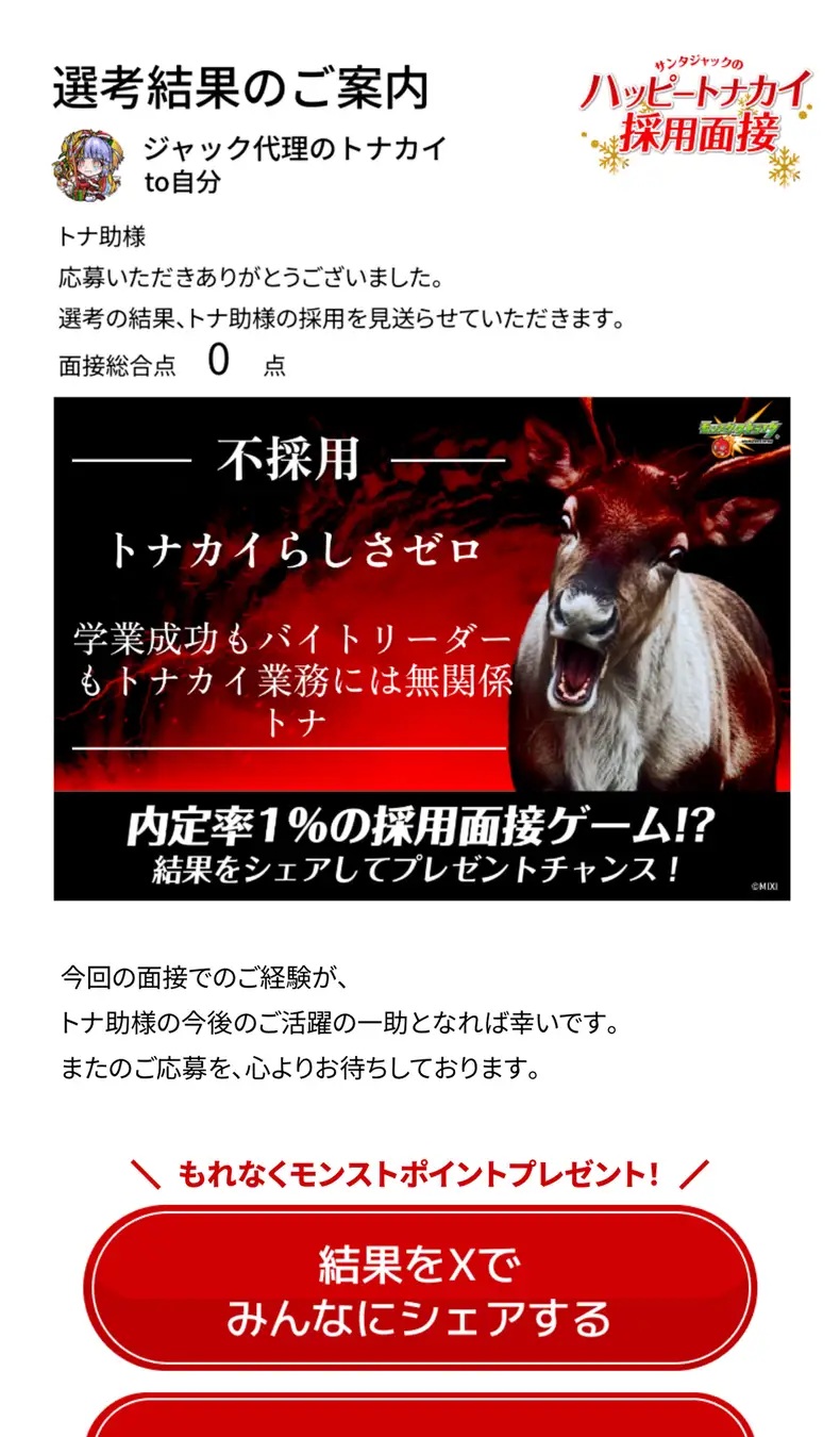 また、惜しくも内定に至らなかった場合でも、面接結果をXでシェアした全員に「モンストポイント10ポイント」をプレゼント。