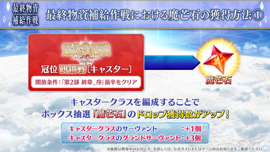 また、キャスタークラスのサーヴァントを編成することで「魔芒石(まぼうせき)」のドロップ獲得数がアップする。「冠位研鑽戦〔キャスター〕」に参加できない場合でも、2025年12月3日18:00~12月 10 日12:59 まで開放される「最終物資補給作戦」のフリークエストで「魔芒石」を獲得できる。
