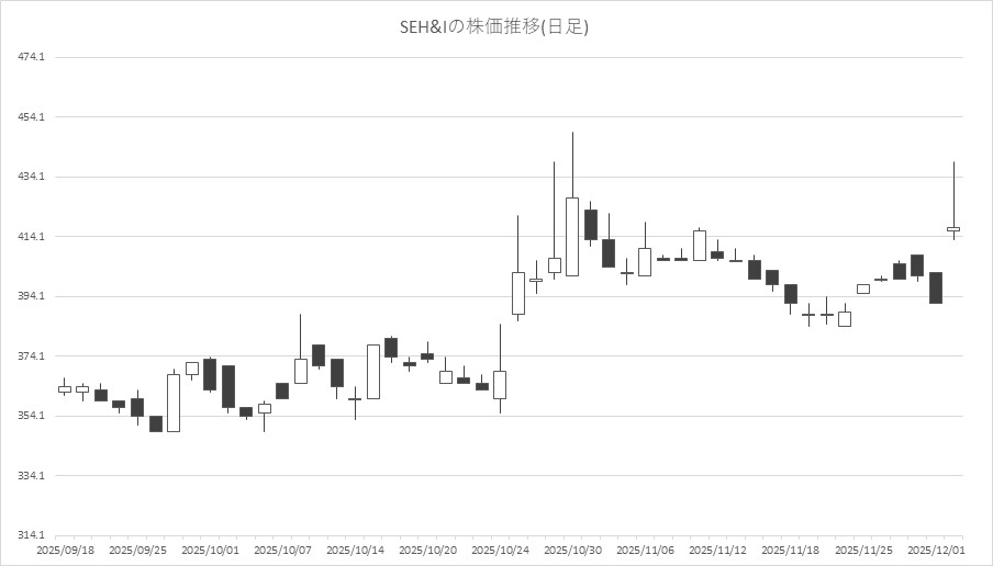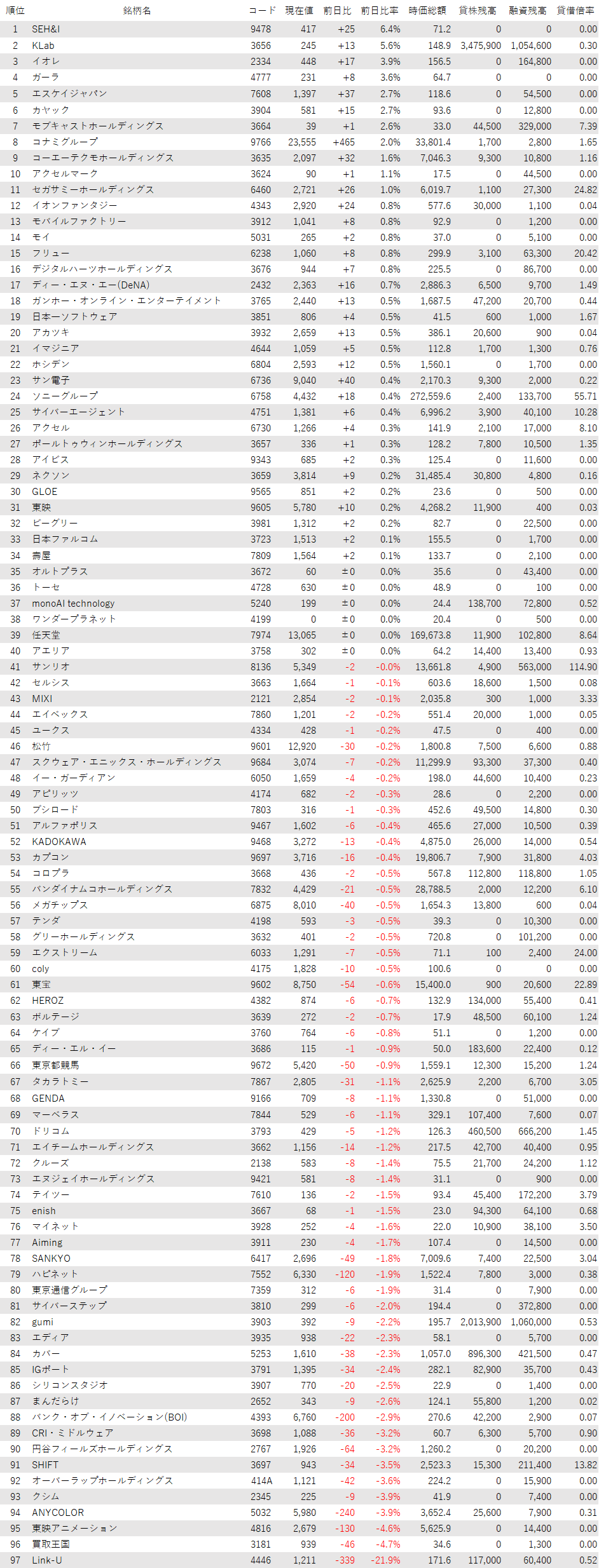 最後に騰落ランキングを見ると、SEH&I<9478>やKLab<3656>、イオレ<2334>、ガーラ<4777>が値上がり率上位となり、Link-U<4446>、買取王国<3181>、東映アニメ<4816>、ANYCOLOR<5032>が値下がり率上位となった。