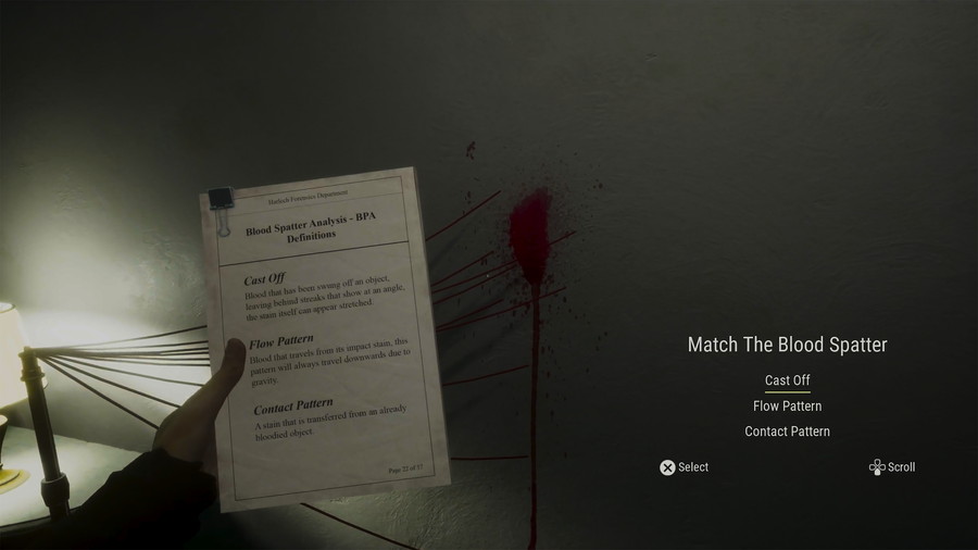 本作は、血痕分析を専門とする鑑識官チャールズ・ダルトンが主人公となる一人称ホラーゲーム。舞台は雪深いHaywood地方にあるチューダー様式の屋敷であり、プレイヤーは血痕の付着角度や形状などの法医学的手掛かりを分析し、現場で何が起きたのかを推理していく。
