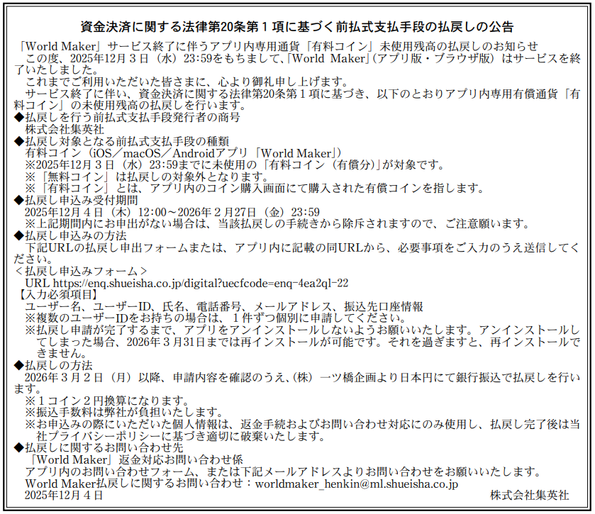 集英社は、『World Maker』のサービスを2025年12月3日をもって終了した。2023年7月12日から2年5ヶ月にわたってサービス提供を行ってきた。12月4日付の「官報」に資金決済法に基づく前払式支払手段の払戻しの公告を掲載している。