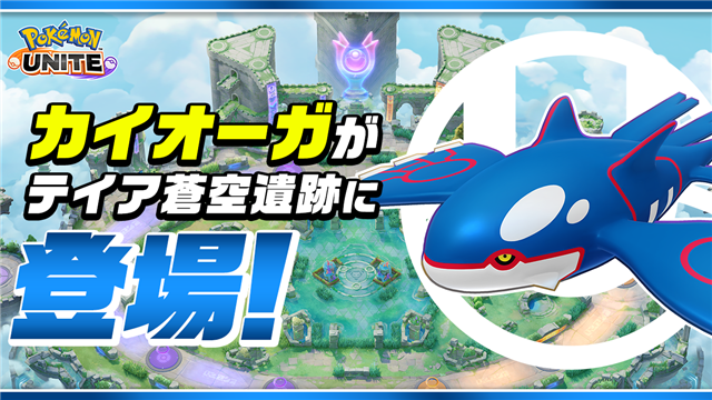 テイア蒼空遺跡に伝説ポケモン「カイオーガ」が登場する。カイオーガをKOしたチームは、ゴールを決めやすくなる効果に加え、HPが持続的に回復していく効果を獲得する。これらの効果は、粘り強く戦うことが得意なバランス型やディフェンス型のポケモンと特に相性が良いため、ラストスパートにおける駆け引きや集団戦の展開がこれまでと大きく変化することが予想される。また、今回のアップデートでも、引き続き地形や草むらの配置など、マップの構成に複数の変更が加わる。これにより、マップとポケモンの相性にも変化が生まれ、これまでとは異なるポケモンたちが活躍するなど、バトル環境の傾向が変わることを期待している。トレーナーに新たなバトル体験をお届けできることを、楽しみにしている。