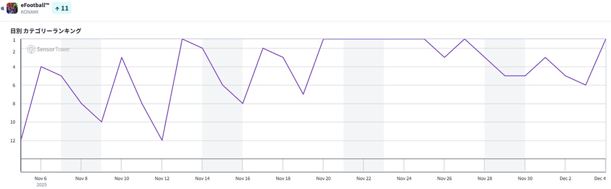 12月5日9時現在のApp Storeセールスランキング(ゲームカテゴリー)は、コナミデジタルエンタテインメントの『eFootball』がトップに立っている。