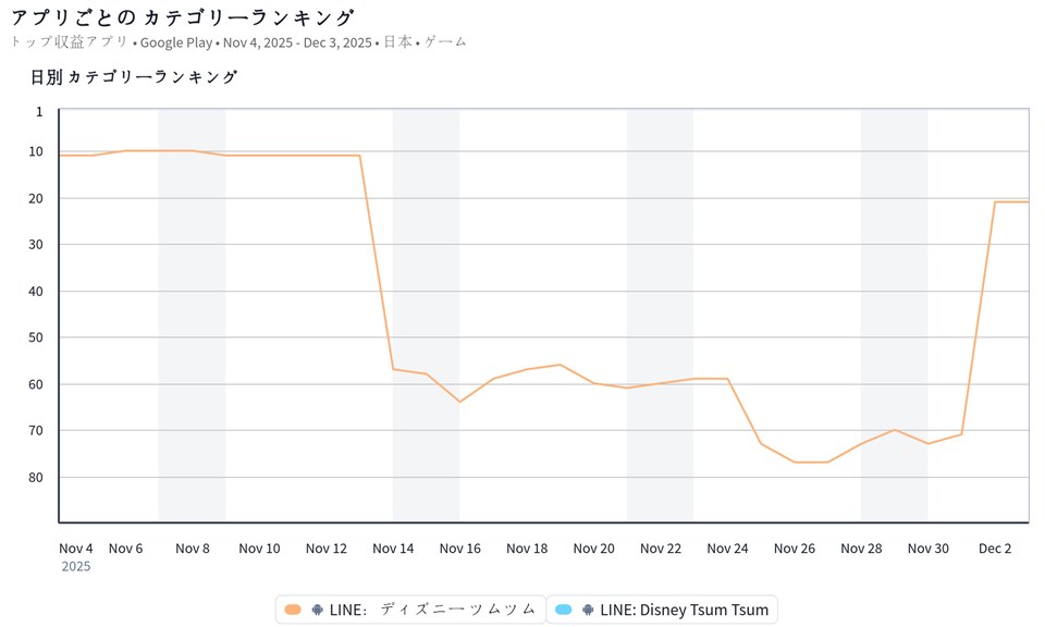ランキングの動きで目立ったのは、前日の71位から21位に急上昇したLINEヤフー<4689>とNHN PlayArtの『LINE:ディズニー ツムツム』だ。『ツムツム』は、12月1日より、12月の新ツムとしてディズニー映画最新作「ズートピア2」より「ジュディ&ニック」と「ゲイリー」が登場していることなどが足元の売上に大きく寄与しているようだ。