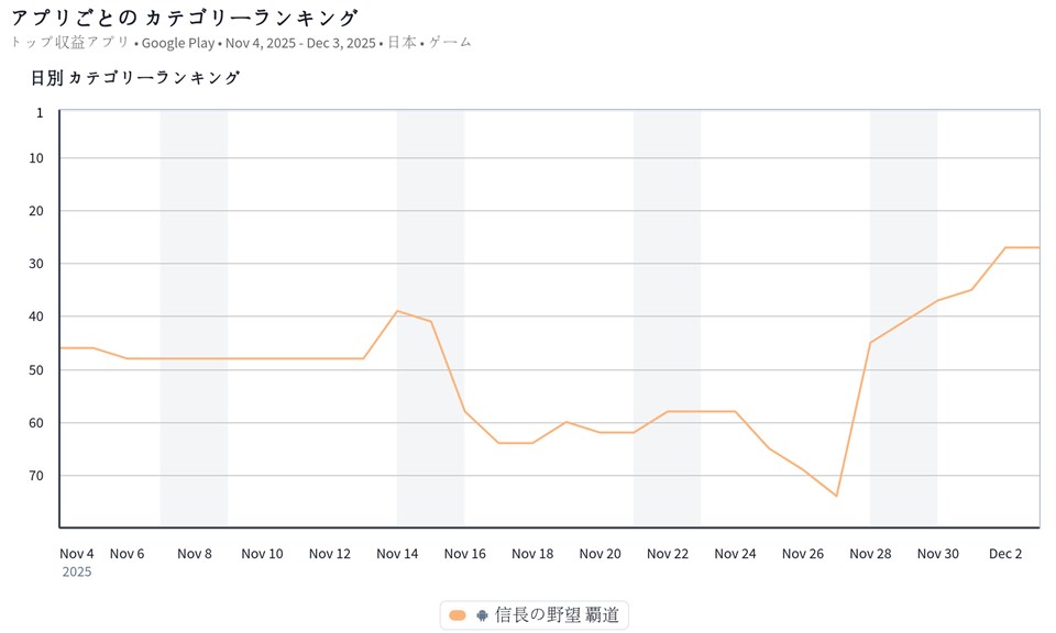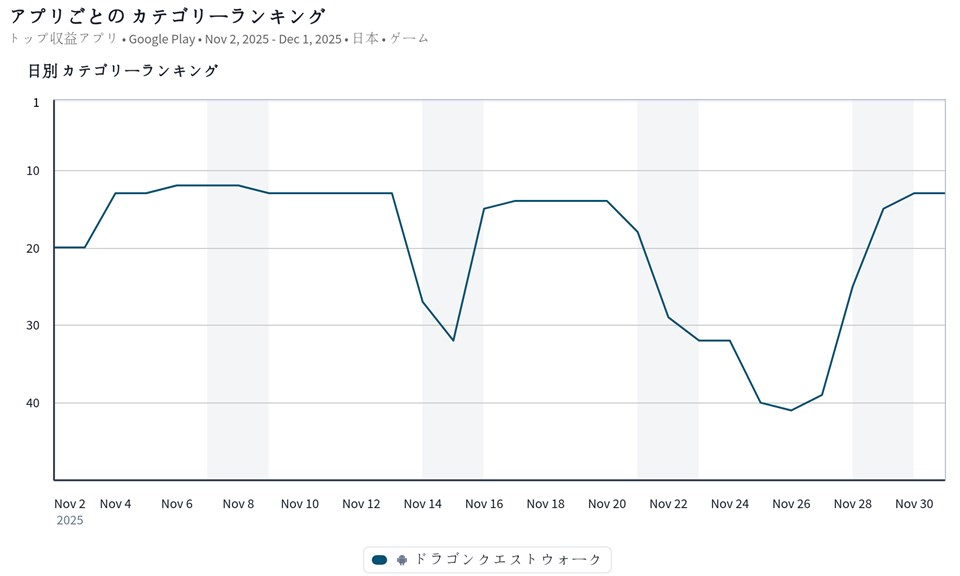 25年11月29日~12月5日のGoogle Play売上ランキング上位の状況を振り返っていこう。まず、首位獲得タイトルと獲得日スは以下の通り。