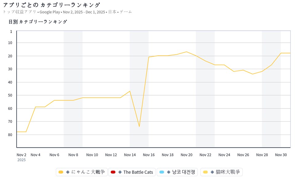 また、ポノスの『にゃんこ大戦争』が18位に急浮上してきた。『にゃんこ大戦争』は、11月27日より、「13周年記念イベント」の第2弾を開始しており、その中で超激レア以上が必ず当たるガチャ「レジェンドガチャ」で使える「レジェンドチケット」を販売していることなどが今回の順位上昇につながっているもよう。