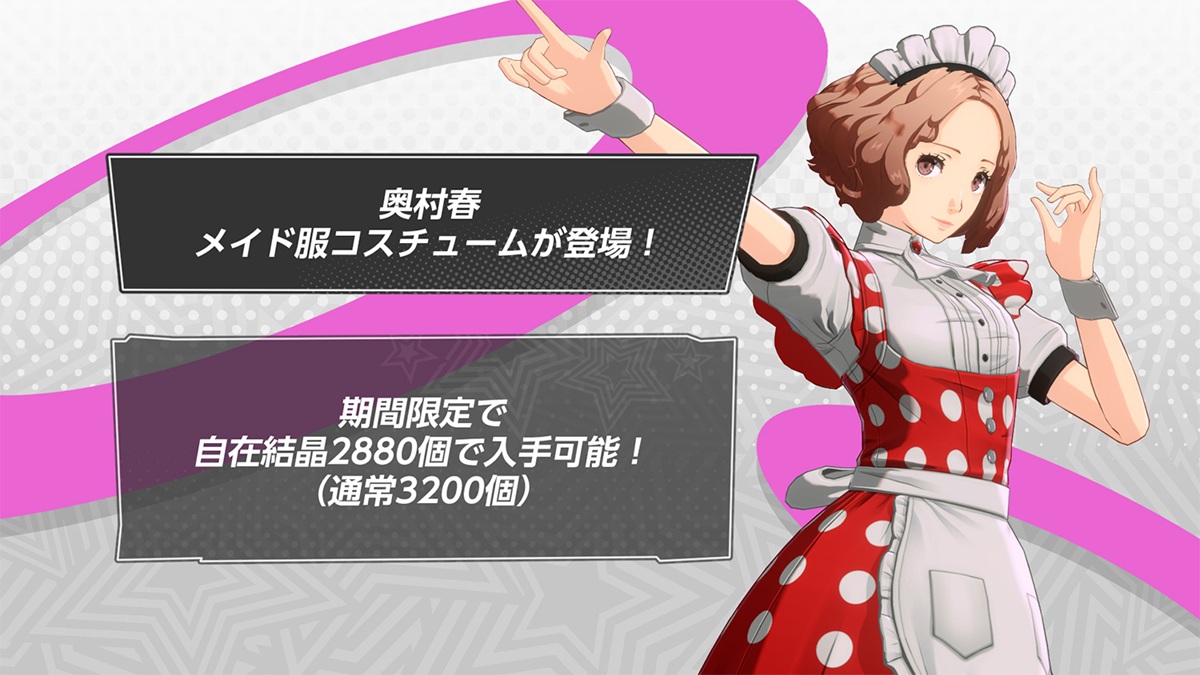 特別な装いでバトルを楽しめる“スペシャルコスチューム”に、「メイド服・奥村 春」が登場した。コスチュームは「ショップ」で購入が可能。また、新コスチュームの登場記念として、2026年1月8日(木)10:59まで、購入に必要な「自在結晶」が3,200→2,880個になるオトクなセールを実施中だ。