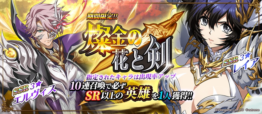 期間限定召喚『燦金の花と剣』は、10連召喚で必ずSR以上の英雄を一人獲得できる。SSRエルヴィスとレイアの出現確率が期間限定でアップする。