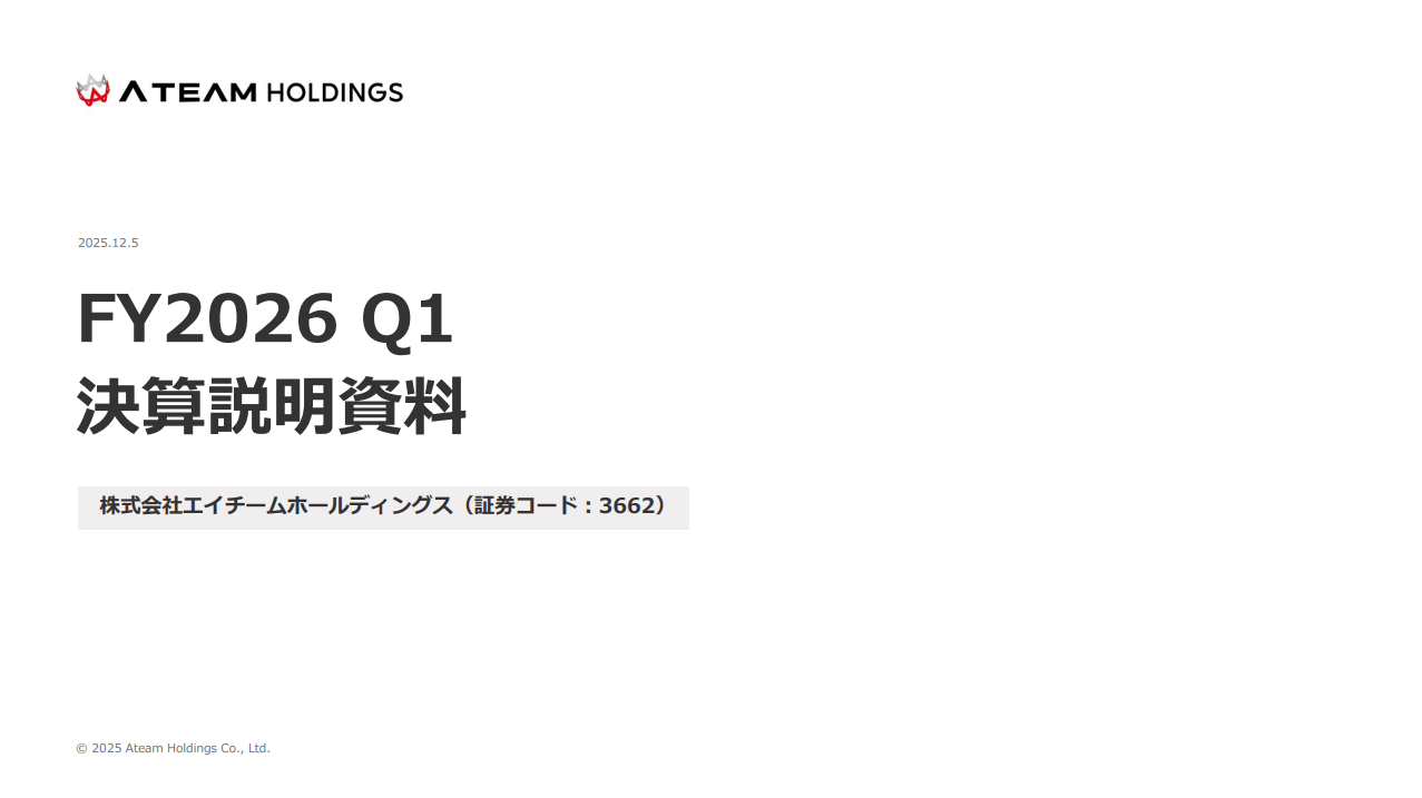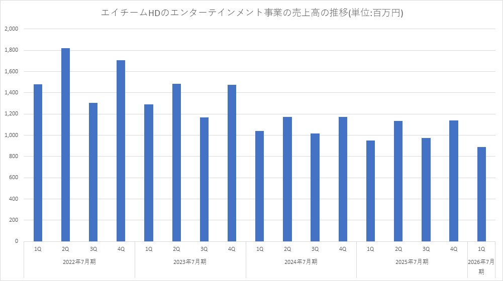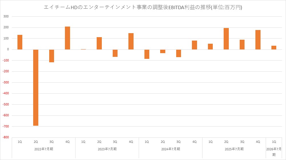 エイチームホールディングス<3662>は、2026年7月期 第1四半期(25年8~10月)の決算説明動画で、エンターテイメント事業の業績について、売上高が前年同期比6.5%減の8億8800万円、調整後EBITDAが同32.1%減の3600万円だった。減収減益での着地となったものの、6四半期連続の黒字を達成した。