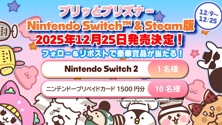 Initiate Gamesは、市村龍太郎氏率いるピンクールが開発する新作タイトル『プリッとプリズナー』をNintendo Switch、Nintendo Switch 2、Steam向けに2025年12月25日から全世界同時発売する。現在、Steam版では体験版を好評配信中である。価格は通常版が1,240円、Nintendo Switch 2 Editionが1,340円(いずれも税込み)からである。