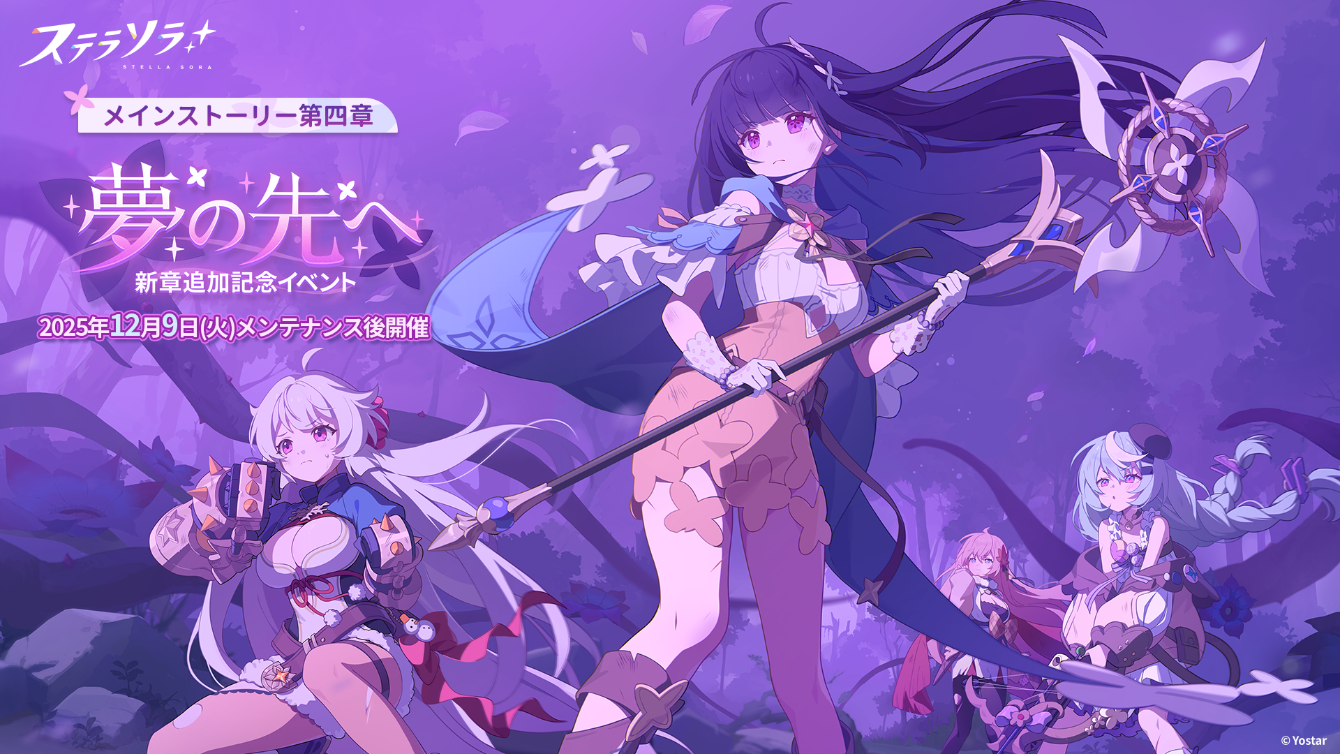 Yostarは、新作スマートフォン/PC(Windows)向けゲーム『ステラソラ』において、12月9日メンテナンス後よりメインストーリー 第四章「夢の先へ」を常設追加し、これを記念したイベント【夢の先へ-新章追加記念イベント】を開催することを発表した。あわせて、★5 新巡遊者「ナツカ」が先行実装で登場するピックアッププガチャ開催なども実施する。