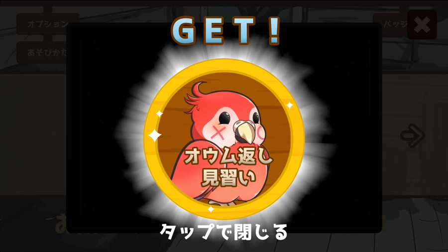 ゲームの進行に応じて全6種類のバッジを獲得し、すべてを集めることで「オウム返しマスター」の称号を得る。