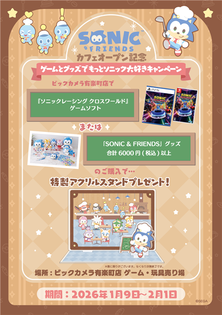 カフェオープンを記念し、同じビル内にあるビックカメラ有楽町店のゲーム・玩具売り場にて、『ソニックレーシング クロスワールド』のゲームソフト、または『SONIC & FRIENDS』グッズを合計6,000円(税込)以上購入した方に「特製アクリルスタンド」をプレゼントする。