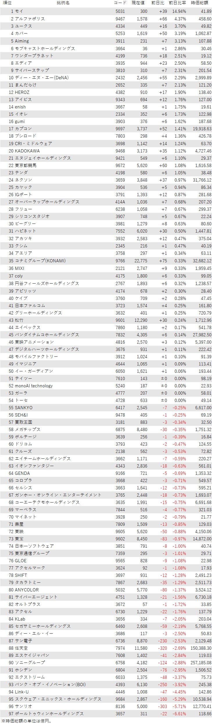 そうした中でゲーム・エンタメ関連株の動きを見てみると、下記の表に登録しているゲーム・エンタメ関連企業97銘柄のうち、上昇は50銘柄(52%)、下落は43銘柄(44%)、変わらずは4銘柄(4%)で、上昇した銘柄のほうが多かった。