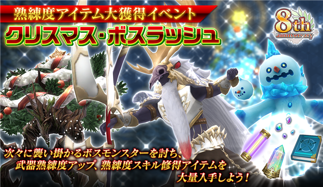 「クリスマス・ボスラッシュ」では、武器熟練度を大きく伸ばせる「極意の玻璃瓶」や、スキル育成に使える「修練の書」を大量に獲得できる。