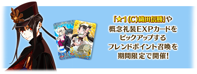 本フレンドポイント召喚からは、通常のフレンドポイント召喚から排出されるものに加え、「★1(C)織田信勝」のほか、概念礼装を大幅に強化できるEXPカード「★4(SR)ようこそ邪馬台国!」「★3(R)猛者と無敵」が排出される。