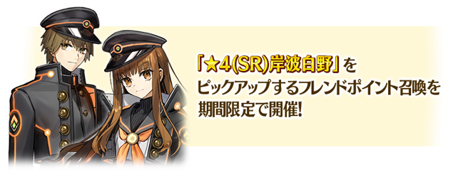 本フレンドポイント召喚における「★4(SR)岸波白野」の召喚確率は、通常のフレンドポイント召喚の3倍となっている。