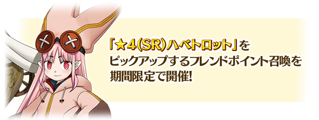 本フレンドポイント召喚における「★4(SR)ハベトロット」の召喚確率は、通常のフレンドポイント召喚の3倍となっている。
