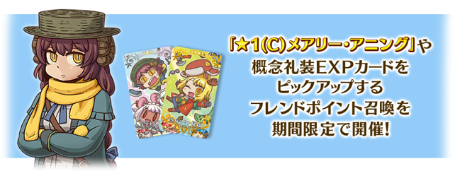本フレンドポイント召喚からは、通常のフレンドポイント召喚から排出されるものに加え、「★1(C)メアリー・アニング」のほか、概念礼装を大幅に強化できるEXPカード「★4(SR)Sバニヤン降臨」「★3(R)大黒天&アニング降臨」が排出される。