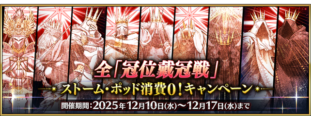 2025年12月10日(水) 18:00~12月17日(水) 12:59までの期間は、すべての「冠位戴冠戦」において、「冠位研鑽戦」に挑む際の「ストーム・ポッド」の消費が0になる。