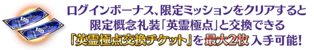 「第2部 終章」限定概念礼装「英霊極点」全21種類から選んで交換できる「英霊極点交換チケット」が登場。期間限定のログインボーナスとミッションで最大2枚獲得できる。「英霊極点」は、ダ・ヴィンチ工房の「イベントアイテムを交換」にて交換可能だ。