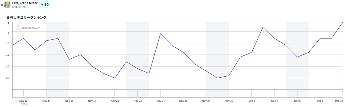 12月11日9時現在のApp Storeセールスランキング(ゲームカテゴリー)は、FGO PROJECTの『Fate/Grand Order』が7ランクアップで首位に立った。