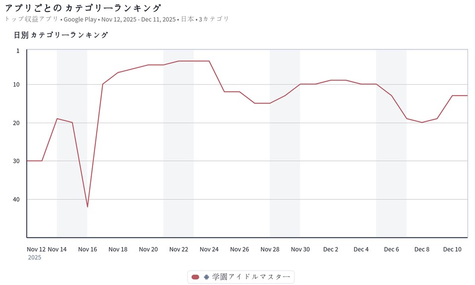 ランキングの動きで目立ったのは、前日の19位から13位に上昇したバンダイナムコエンターテインメントの『学園アイドルマスター』だ。『学マス』は、12月8日より、新SSR Pアイドル「【Atmosphere】葛城リーリヤ」が登場した「Atmosphereガシャ」を開催していることが売上に寄与しているようだ。