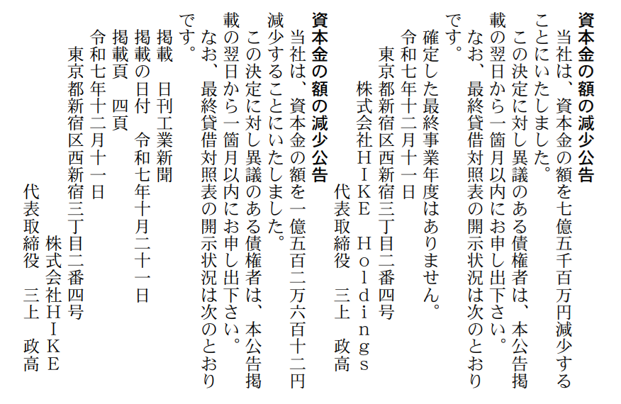 HIKE Holdingsとその子会社であるHIKEが減資を行うことがわかった。本日12月11日付の「官報」に掲載された「資本準備金の額の減少公告」によると、資本金をHIKE Holdingsは資本金を7億5100万円、HIKEは1億5100万円減らすとのこと。
