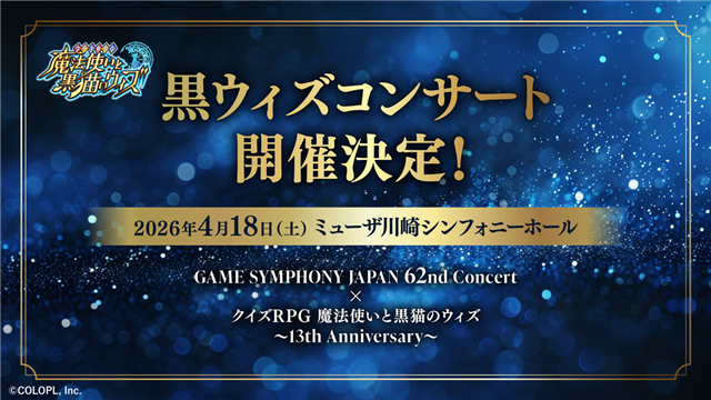 『黒猫のウィズ』13周年を記念したコンサート「GAME SYMPHONY JAPAN 62nd Concert × クイズRPG 魔法使いと黒猫のウィズ〜13th Anniversary〜」の開催が決定した。チケット情報などの続報は、アイムビレッジ公式X(https://x.com/AimVil_MusicDiv)にて順次発表予定。