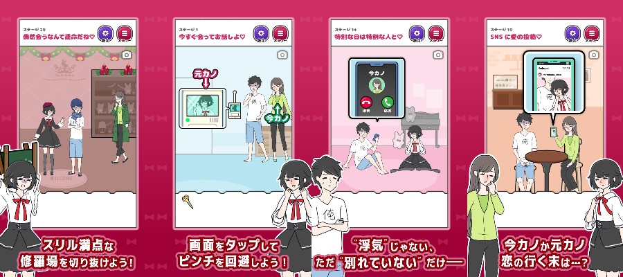 ステージは「今すぐ会ってお話しよ(ハート)」「恋はいつでもスリリング(ハート)」「恋人と過ごすクリスマス(ハート)」など、元カノと今カノにまつわる様々なシチュエーションを描いた全28ステージに加え、2つのシークレットステージが用意されている。