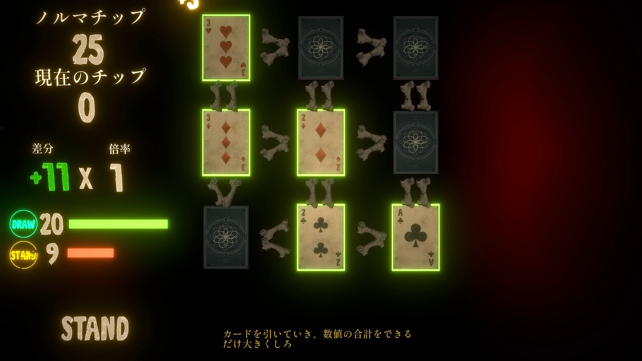 ゲームは全体で3セット×12回あるが、3セットおきにアイテムを渡される。アイテムを使うことでさらに得点を伸ばすことができる。アメミトから要求されるチップ数は回を増すごとに増えていくため、アイテムをうまく組み合わせることが鍵となるでしょう。21を目指すだけでなく、アイテムとのシナジーを考えながらカードを引いていく必要がある。