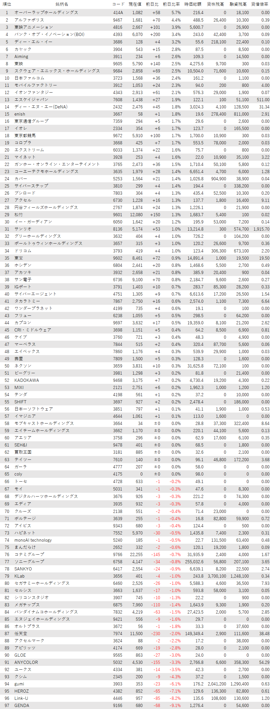 また、登録されている97銘柄のうち、上昇は57銘柄(59%)、下落は32銘柄(33%)、変わらずは8銘柄(8%)で、買い優勢だった。前週から続く出遅れ銘柄・セクターを物色する動きが続いていると見られるが、本格的な水準訂正までには至っていない。