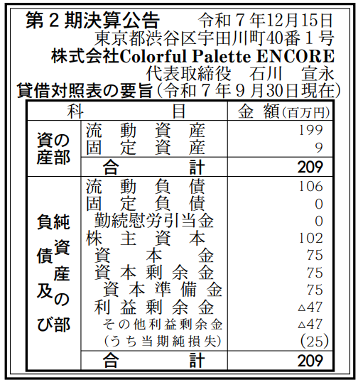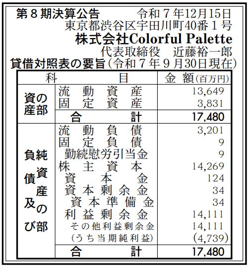サイバーエージェント<4751>グループのColorful Palette(カラフルパレット)の2025年9月期(第8期)の決算は、最終利益が前の期比38.7%増の47億3900万円と大幅な増益を達成した。前の期(2024年9月期)の実績は、最終利益34億1600万円だった。本日12月15日付の『官報』に掲載された「決算公告」で判明した。