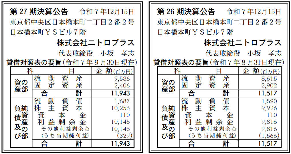 ニトロプラスの2025年8月期(第26期)の決算は、最終利益が前の期比102.5%増の15億6600万円と大幅増益を達成した。前の期(2024年8月期)の実績は、最終利益7億7300万円だった。12月15日付の『官報』に掲載された「決算公告」で判明した。あわせて決算期を親会社であるサイバーエージェント<4751>に合わせて9月期に変更したとのことで、1ヶ月のみとなるが25年9月期(第27期)の「決算公告」もあわせて公開した。