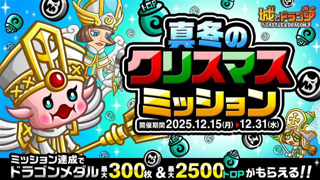 アソビズムは、『城とドラゴン』において、「真冬のクリスマスログインボーナス」と「真冬のクリスマスミッション」を12月15日より開催することを発表した。