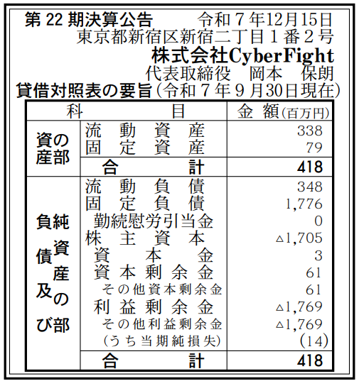 CyberFight(サイバーファイト)の2025年9月期(第22期)の決算は、最終損失が1400万円と赤字幅が大幅に減った。前の期(2024年9月期)の実績は、最終損失2億1200万円だった。12月15日付の『官報』に掲載された「決算公告」で判明した。