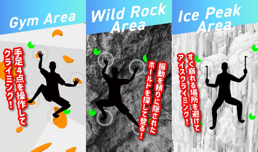 プレイヤーは、掴んでいられる時間が異なるホールドでの練習が行えるボルダリングジム、振動を頼りに微妙なホールドを探りながら登るスリル満点のワイルドロックエリア、氷の溶け具合で難度が変わる本格的なアイスピークエリアという3つのクライミングモードに挑戦できる。