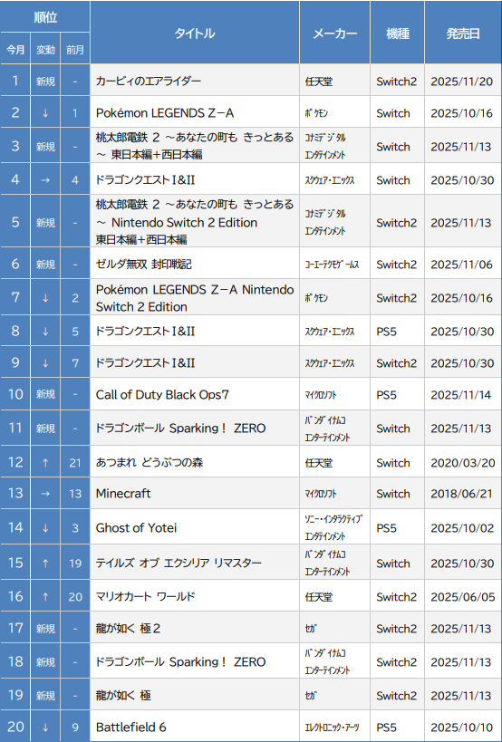 新規では10月16日に発売されたポケモンシリーズ最新作『Pokémon LEGENDS Z-A』が、Switch版で2位、Switch2版で14位にそれぞれ早速ランクインした。また、10位には10月30日に発売されたSwitch『ドラゴンクエストI&II』がランクインしている。