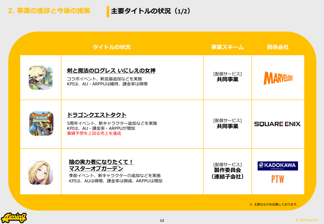 Aiming<3911>は、この日(12月16日)、『陰の実力者になりたくて!マスターオブガーデン』の国内版製作委員会について、同社の出資比率が47.8%から77.8%に上昇したことを明らかにした。変更理由について、共同出資をした他社による製作委員会からの脱退と、製作委員会からの配当金受領にかかる出資比率の変更に合意したため、と説明している。脱退した他社については開示していない。