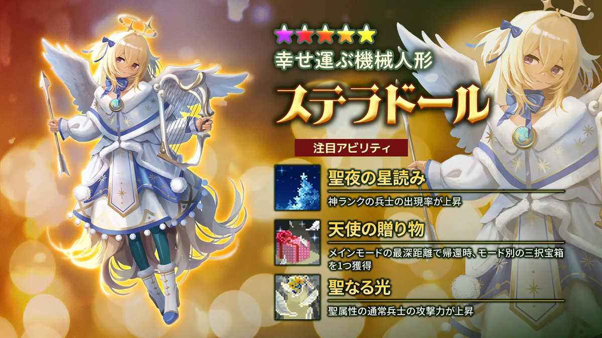 「【幸せ運ぶ機械人形】ステラドール」として再登場したアイドールは、神ランク兵士の出現率がアップするアビリティを実装。可憐な姿で出撃時の総合的な戦力をアップする。