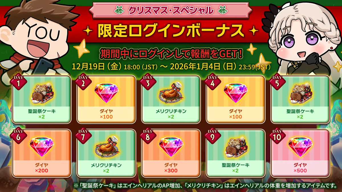 キャンペーン中の限定ログインボーナスでは、ダイヤのほか、この季節限定のアイテムをプレゼント。「生誕祭ケーキ」はエインヘリアルのアビリティポイント(AP)を増加、「メリクリチキン」はエインヘリアルの体重を増加する強化アイテム。