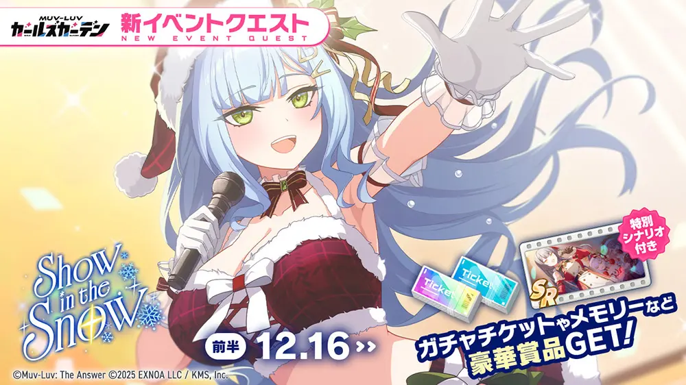 EXNOAとKMSが贈るマブラヴ最新作『マブラヴ ガールズガーデン』(以下、マブガル)が12月15日(月)より、公式Discordにてクリスマスアドベントカレンダーキャンペーンを開催中。また、ゲーム内では新イベント【Show in the Snow】後半を開催し、新衣装の「綺羅クララ」【聖夜のサンタシンガー】が登場した。