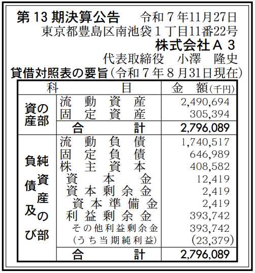 A3(エースリー)の2025年8月期(第13期)の決算は、最終利益が前の期比91.9%減の2300万円と減益だった。前の期(2024年8月期)の実績は、最終利益2億8900万円だった。12月17日付の『官報』に掲載された「決算公告」で判明した。
