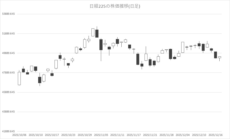 12月17日前場の東京株式市場は反発。日経平均株価は、前営業日比170円42銭高の4万9553円71銭で午前中の取引を終えた。小幅高で寄り付いた後、マイナスに転じたが、買い戻しが入ってプラスに転じた。ただ、米国雇用統計は無事通過したものの、日銀金融政策決定会合や米国消費者物価指数を控えており、様子見ムードが広がっているという。