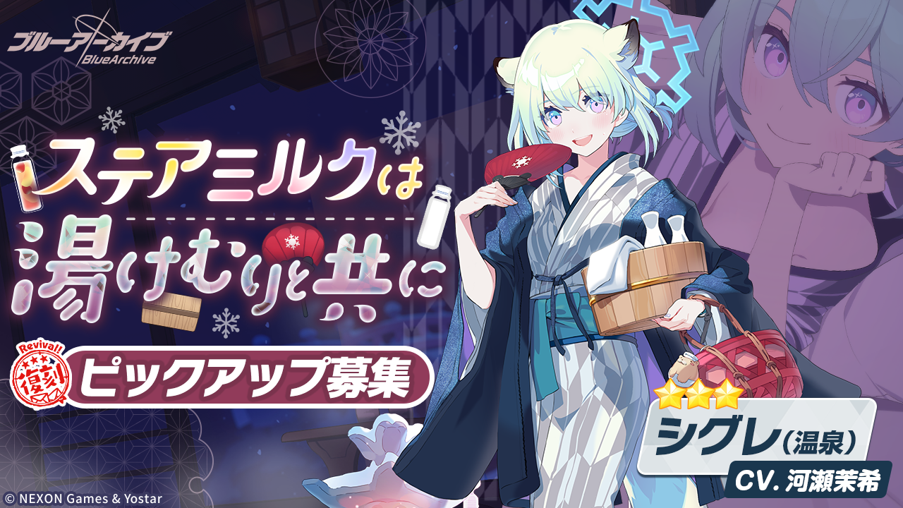 レッドウィンター連邦学園所属、図書委員会「知識解放戦線」のメンバー「メル」と「モミジ」、「工務部」の部長「ミノリ」に、「227号特別クラス」の生徒で、温泉浴衣姿に着替えた「シグレ(温泉)」。また、アビドス高等学校所属、「アビドス対策委員会」のメンバー「セリカ(水着)」も加えた、計 5 名のピックアップ募集になる。