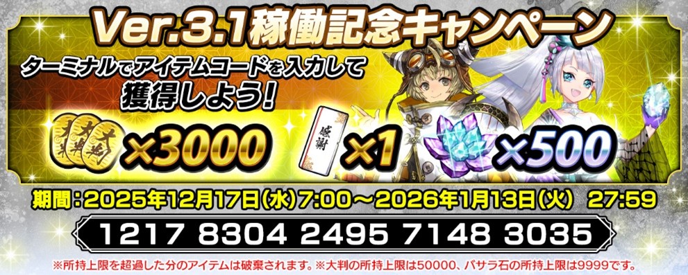 新バージョンの稼働を記念して、ターミナルにアイテムコードを入力した全員に大判×3000、バサラ石×500と感謝の手紙×1をプレゼントするキャンペーンも実施する。
