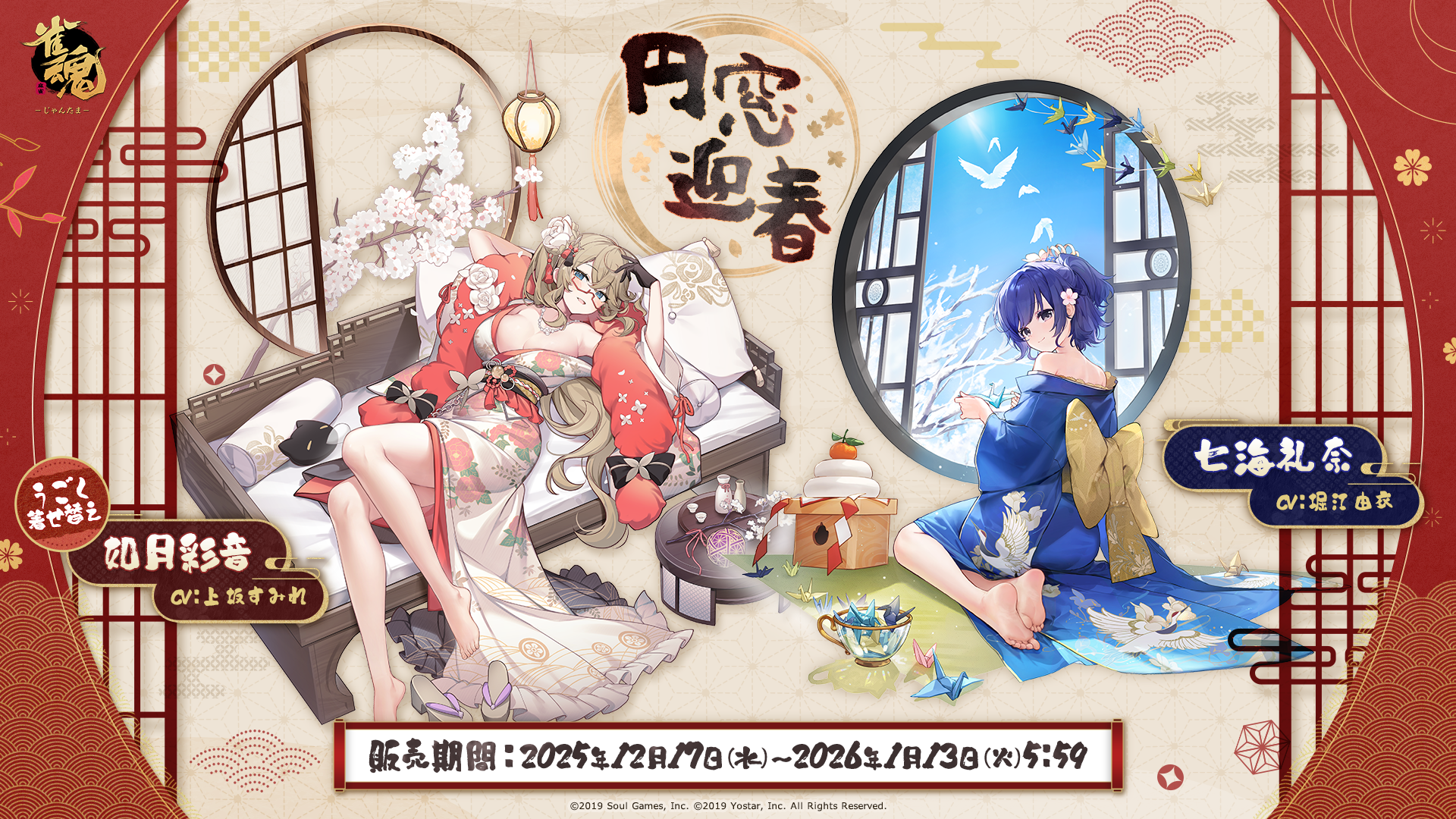 12 月 17 日(水)より、祈願でピックアップ中の雀士たちの新規着せ替え「ユキノソナタ」「雪間の春兆」 を期間限定で販売。また復刻着せ替えも登場する、この機会をお見逃しなく!