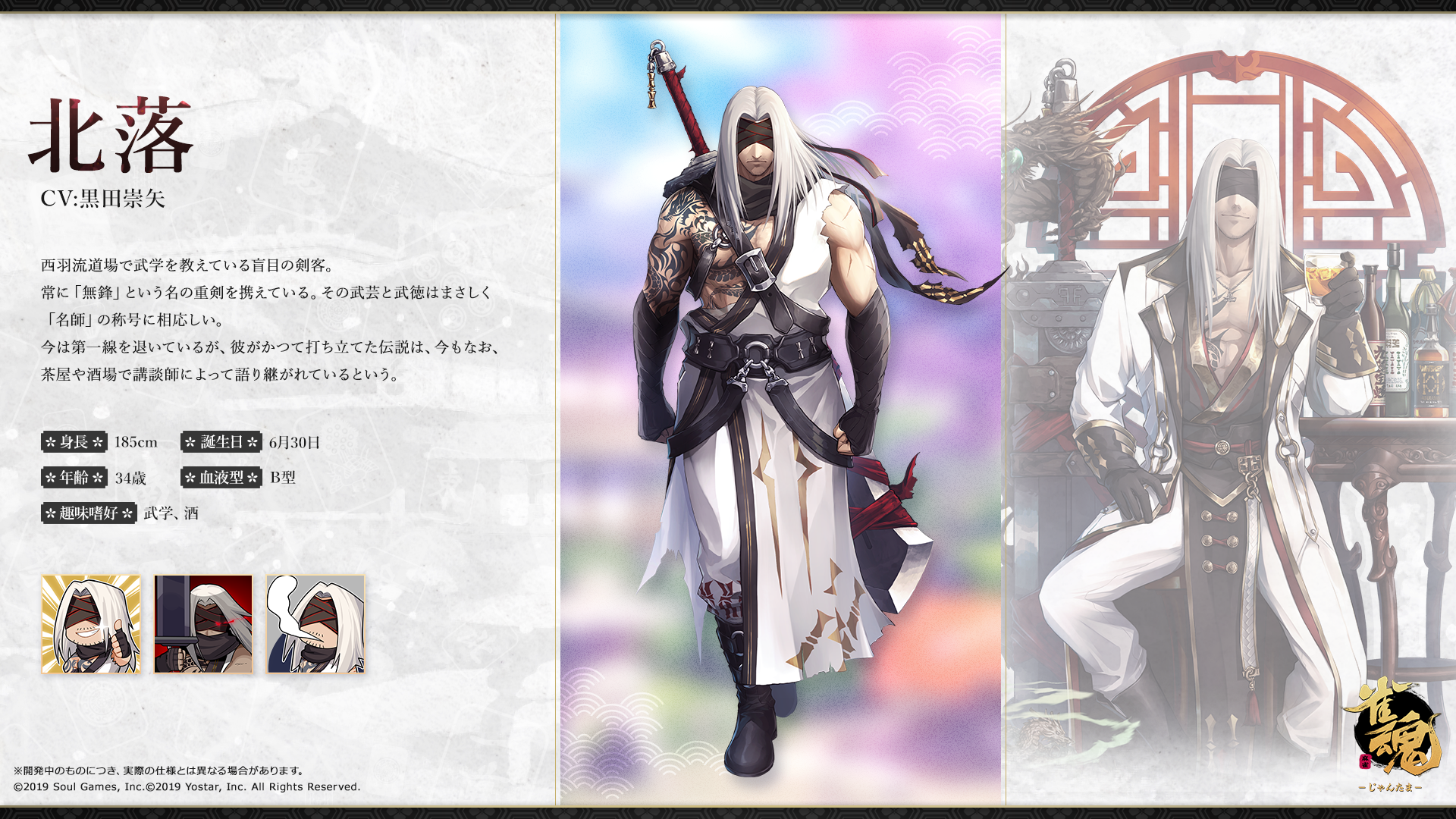 「北落」は西羽流道場で武学を教えている盲目の剣客。常に「無鋒」という名の重剣を携えている。その武芸と武徳はまさしく「名師」の称号に相応しい。